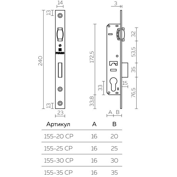 Корпус узкопрофильного замка с роликовой защелкой PROF155-25 (155-25) CP хром
