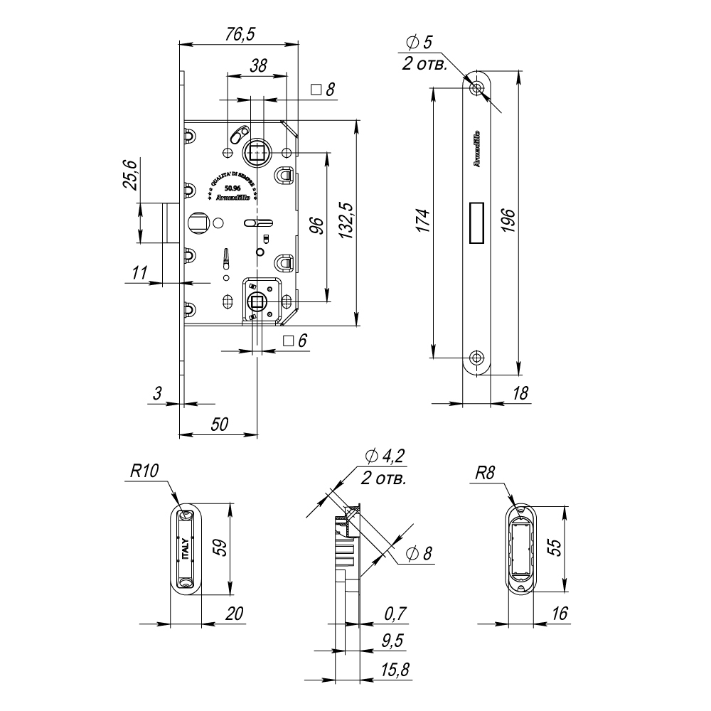 Материал защелки - Магнитная защелка Межосевое расстояние - 96 мм Ответная планка - Есть Удаление квадрата под ручку - 50 мм Тип упаковки - Коробка