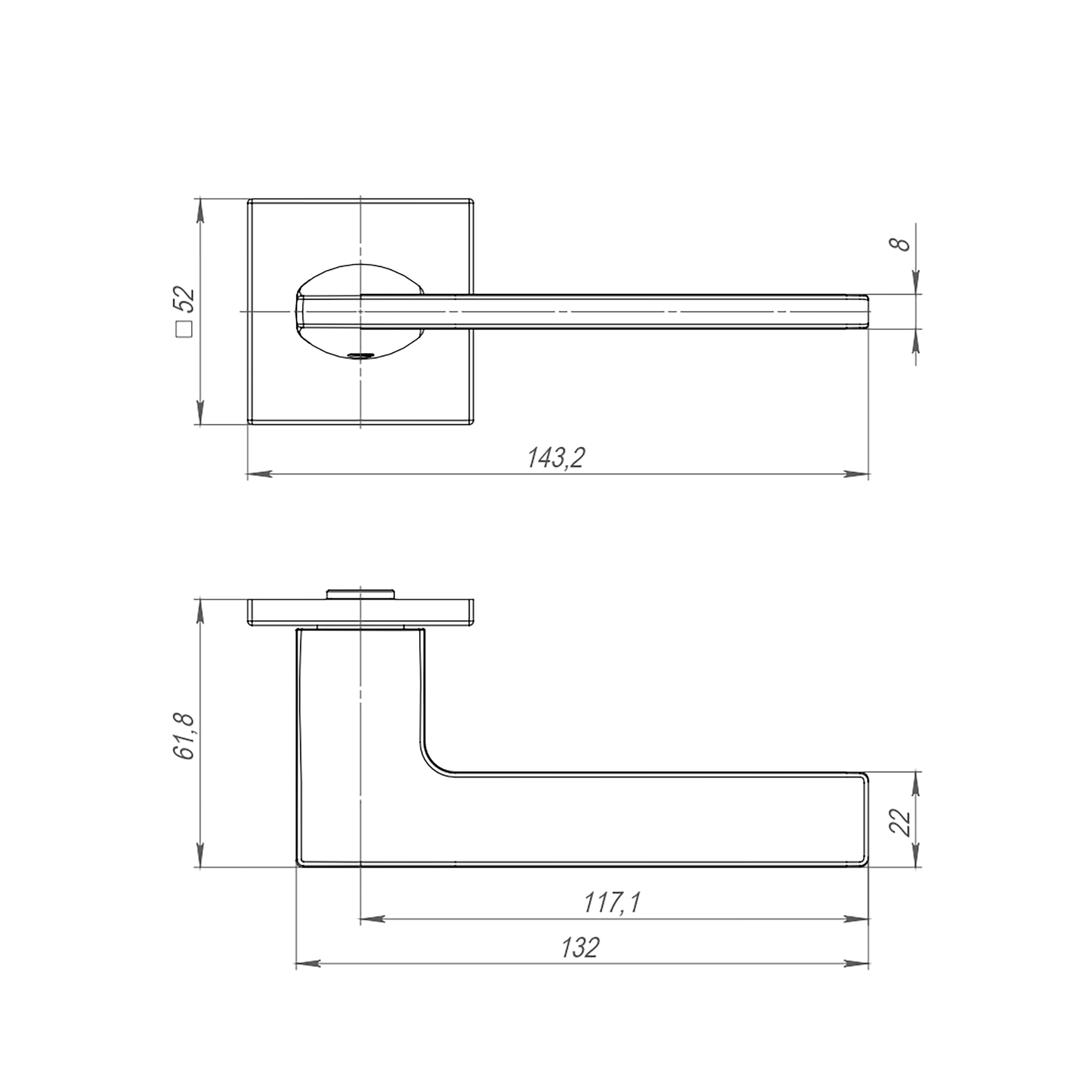 Диаметр розетки (основания) - 52 мм Длина квадрата - 8×105 Материал - Алюминий Покрытие - Гальваника Тип упаковки - Коробка