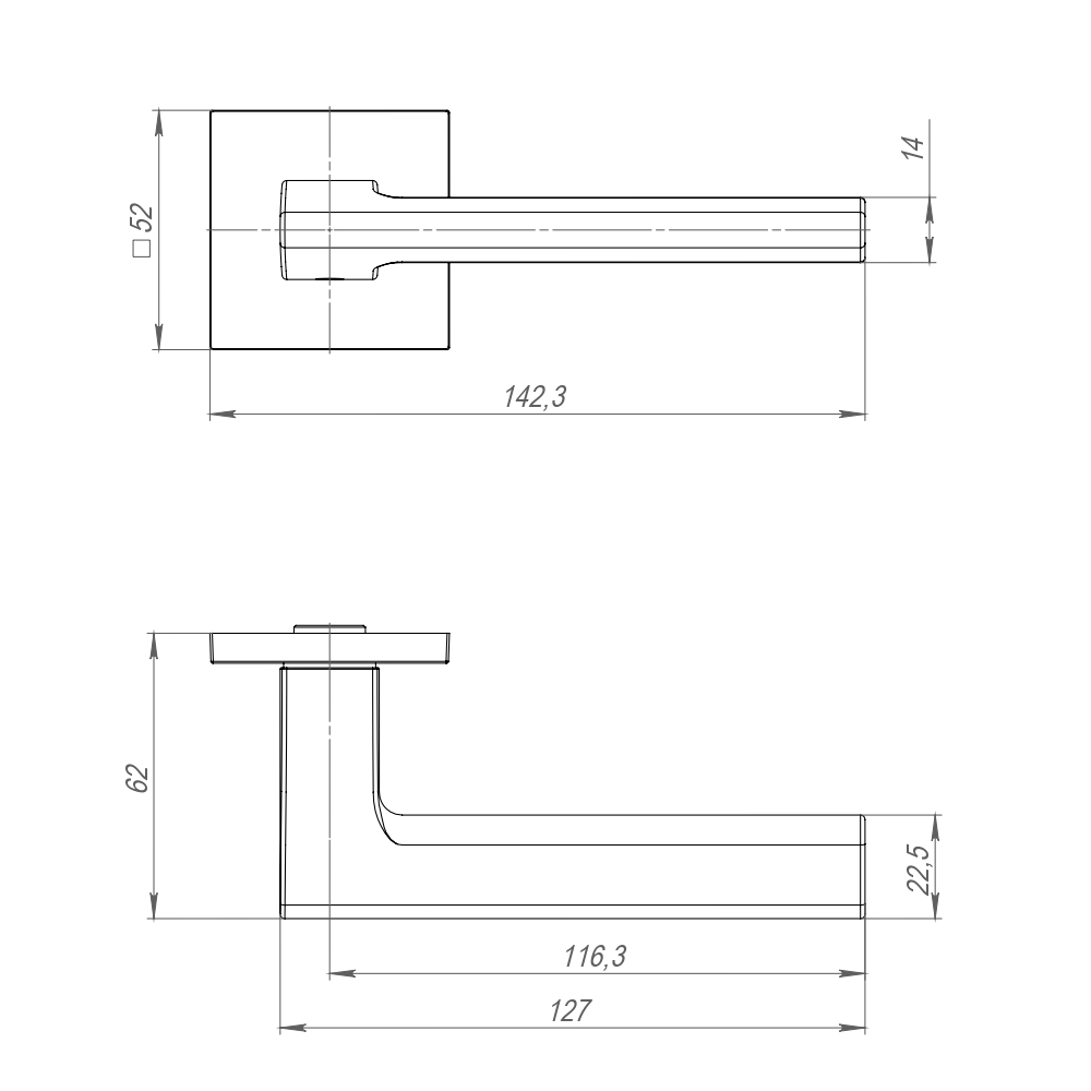 Диаметр розетки (основания) - 52 мм Длина квадрата - 8×105 Материал - Алюминий Покрытие - Гальваника Тип упаковки - Коробка