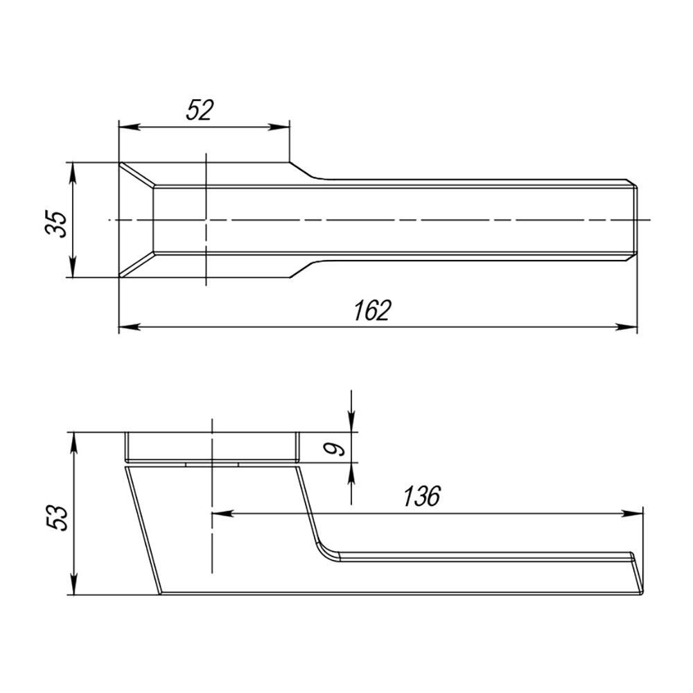 Диаметр розетки (основания) - 52х35 мм Длина квадрата - 8×105 Материал - Алюминий Покрытие - Гальваника Тип упаковки - Коробка
