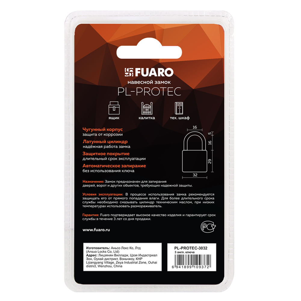 Замок навесной PL-PROTEC-3032 3key (PL-3032) англ. /блистер